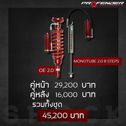 โช๊คอัพ PROFENDER MONOTUBE ปรับ 8 ระดับ + PIGGYBACK สำหรับ รถกระบะ และ รถ SUV - เป็นโช๊คระบบเปิดสามารถเปิดซ่อมได้ตลอดอายุการใช้งาน ประหยัดค่าใช้จ่ายในการซ่อมบำรุง - ให้ความนุ่มนวลในการขับขี่ - โช๊คสามารถปรับเซ็ทค่าน้ำหนักได้ - เหมาะสมสำหรับใช้งานในเมืองและเดินทางไกล - ทนทานต่ออุณหภูมิสูงโดยที่ความหนืดเปลียนแปลงน้อยมาก - มีระบบการระบายความร้อนที่ดีผ่านผนังชั้นเดียว - เหมาะสมหลายลักษณะการใช้งาน - ดูแลรักษาและติดตั้งได้ง่าย - สามารถปรับระดับนำ้หนักได้ 8 ระดับ